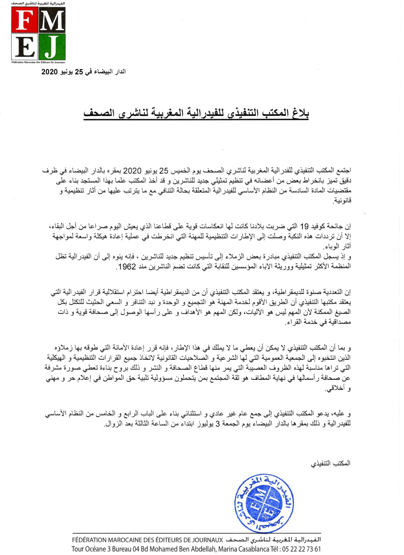 ودعا المكتب التنفيذي في هذا الصدد إلى جمع عام غير عادي واستثنائي بناء على الباب الرابع والخامس من النظام الأساسي للفيدرالية المغربية لناشري الصحف، وذلك بمقر الفيدرالية بالدار البيضاء يوم الجمعة 3 يوليوز ابتداء من الساعة الثالثة بعد الزوال.