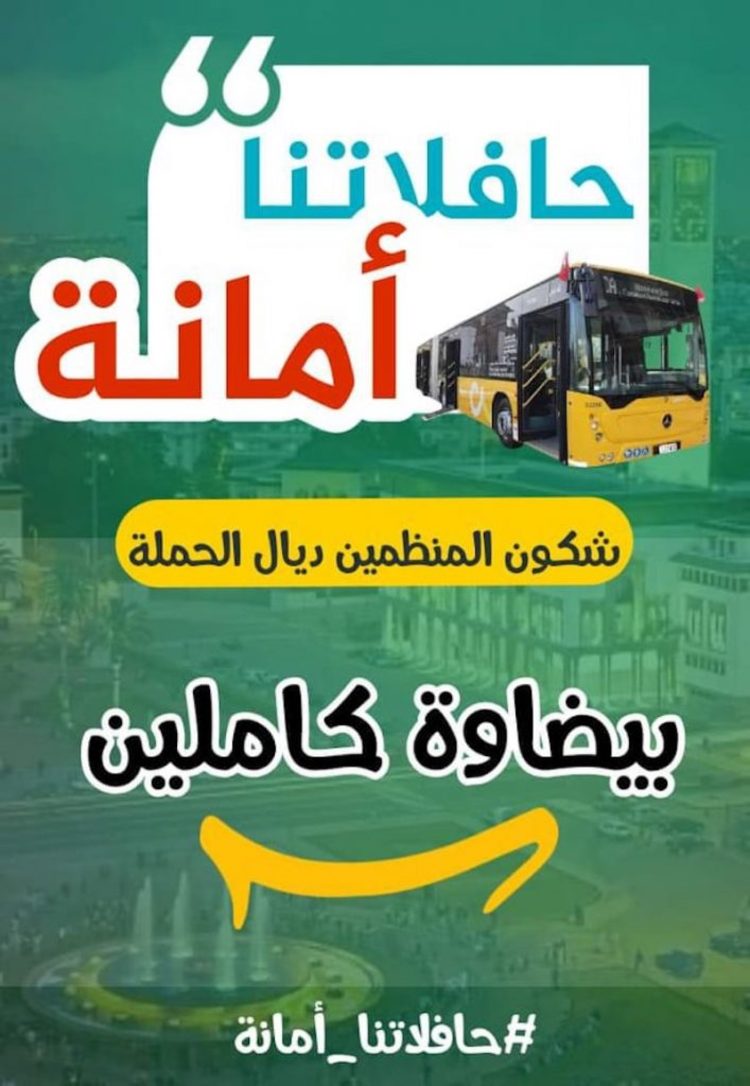 بعدما بلغت حصيلة عدد الحافلات الجديدة التي تعرضت للتخريب، يومي السبت والأحد بالعاصمة الاقتصادية، 9 حافلات، كما كشف مصدر مسؤول بشركة النقل الحضري “ألزا”. أطلق شباب مغاربة حملة تحسيسية تحت عنوان “حافلاتنا أمانة”، بالدار البيضاء، عبر مواقع التواصل الاجتماعي، تزامنا مع انطلاق أسطول الحافلات الجديدة،  يوم الجمعة الماضي.
