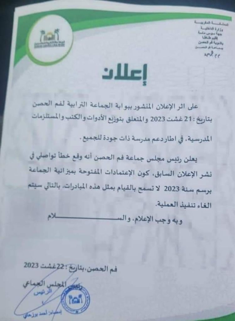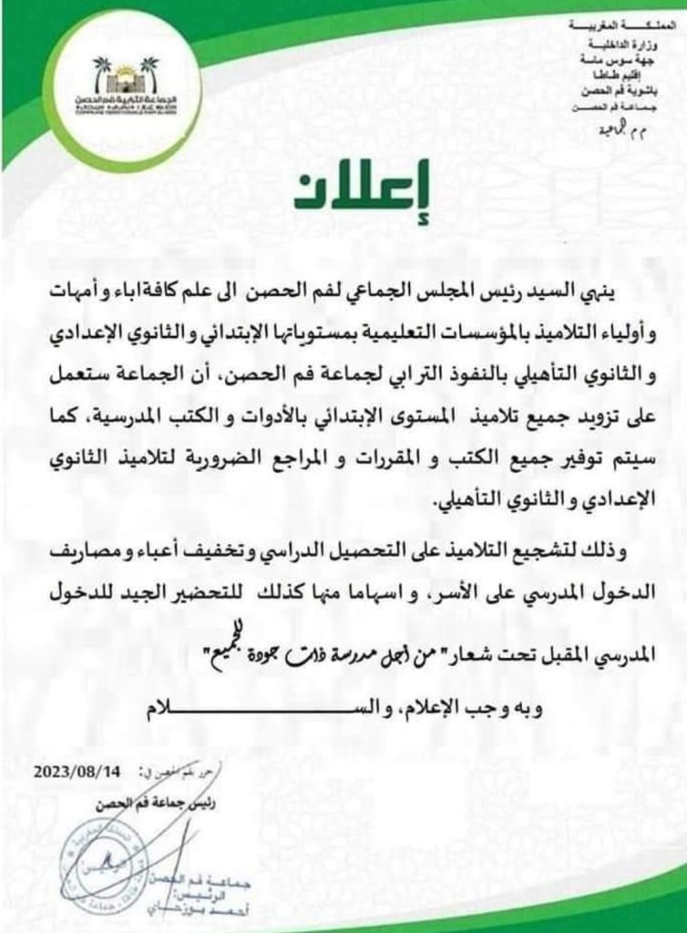 “ينهي السيد رئيس المجلس الجماعي لفم الحصن إلى علم كافة آباء وأمهات وأولياء التلاميذ بالمؤسسات التعليمية بمستوياتها الابتدائي والثانوي الإعدادي والثانوي التأهيلي بالنفوذ الترابي لجماعة فم الحصن، أن الجماعة ستعمل على تزويد جميع تلاميذ المستوى الابتدائي بالأدوات والكتب المدرسية، كما سيتم توفير جميع الكتب والمقررات والمراجع الضرورية لتلاميذ الثانوي الإعدادي والثانوي التأهيلي”.