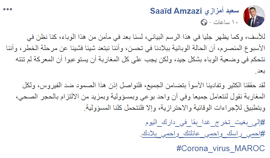 أضاف أمزازي “لقد حققنا الكثير وتفادينا الأسوأ بتضامن الجميع، فلنواصل إذن هذا الصمود ضد الفيروس، ولكل المغاربة نقول لنتعامل جميعا وفي آن واحد بوعي وبمسؤولية وبمزيد من الالتزام بالحجر الصحي، وبتطبيق للإجراءات الوقائية والاحترازية، وإلا فلنتحمل كلنا المسؤولية”.