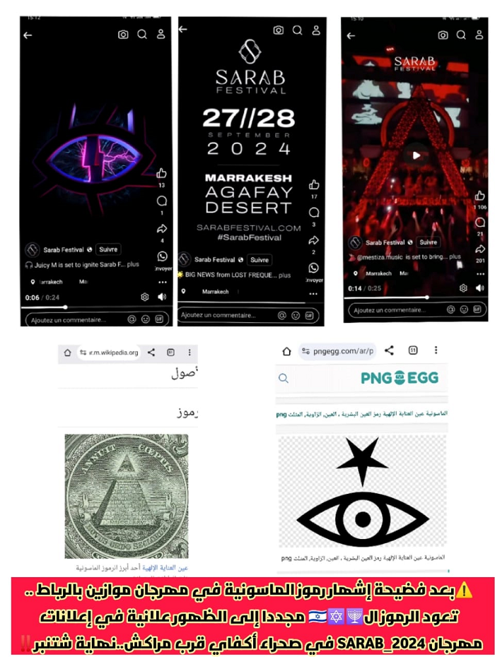 “بعد فضيحة إشهار رموز الماسونية في مهرجان موازين بالرباط .. قبل أسابيع .. موازاة مع حرب الإبادة الجماعية في غزة.. بل وفي سياق وفاة والدة الملك…!! … تعود الرموز الماسونية مجددا إلى الظهور علانية في إعلانات مهرجان SARAB_2024 للموسيقى الإلكترونية الصاخبة في صحراء أكفاي قرب مراكش.. نهاية شتنبر 2024.. في عز مواصلة حرب الإبادة الجماعية بحق الشعب الفلسطيني..!!”.