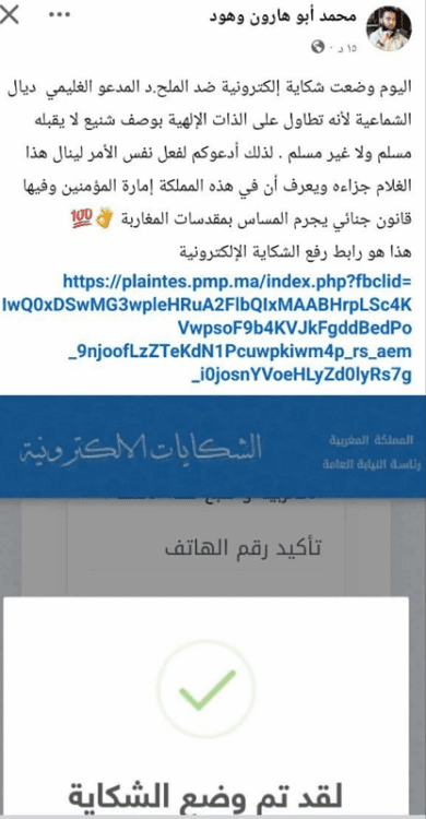 هذا التحدي الخطير أثار غضب المتابعين والمدونين، وفي هذا الصدد أقدم مواطنون على رفع شكاية لدى النيابة العامة كي تتخذ ما تراه مناسبا؛ في إطار القوانين الجاري بها العمل.