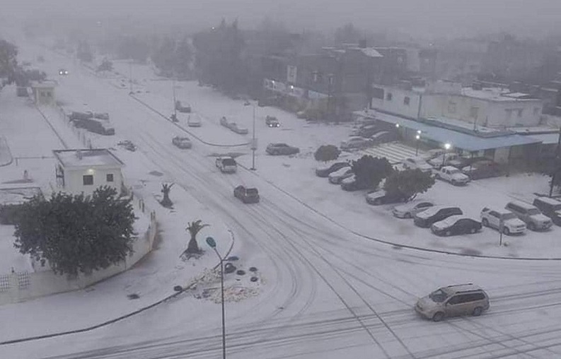 في ليبيا، الأجواء لم تختلف كثيرا، حيث غطت الثلوج شوارع مدينة البيضاء الليبية، بعدما هطلت عليها بكثافة طوال يومي الأحد والاثنين الماضيين.