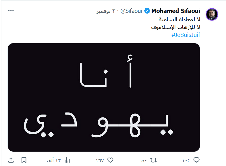 ولكن هؤلاء يفضحون أنفسهم بأنفسهم؛ فشعار “أنا يهودي” الذي رفعه هذا الشخص يكشف نواياه الحقيقية؛ ويحاول أن يتقرب أكثر من الطائفة اليهودية في فرنسا؛ لكن الصراع ليس مع اليهود بل مع الاحتلال؛ وقد أطلقت المقاومة أسرى إسرائيليين وهم يهود؛ وتجنبت قتل المدنيين وهم يهود؛ لأن الصراع ليس معهم بل مع الاحتلال أولا ومع كل يهودي مسلح لديه نوايا إجرامية ثانيا”.