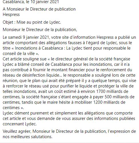 وقال المدير العام، في رسالة تقدم بها المدير العام لـ”هسبريس”، وتوصل بها موقع “هوية بريس”، أن الموقع نشر معطيات مغلوطة نسبت للمدير العام لـ”لديك”، في المقال المنشور يوم السبت الماضي 9 يناير الجاري “على أن المخطط الذي تم إعداده منذ مدة، والذي يروم تقوية الشبكة المهترئة لتطهير السائل وحماية المدينة من مثل هذه الفيضانات، قدرت تكلفته بما يناهز 1700 مليار سنتيم، إذ التزمت الشركة الفرنسية بدفع 500 مليار سنتيم، بينما تلكأ العمدة في تعبئة 1200 مليار سنتيم”.