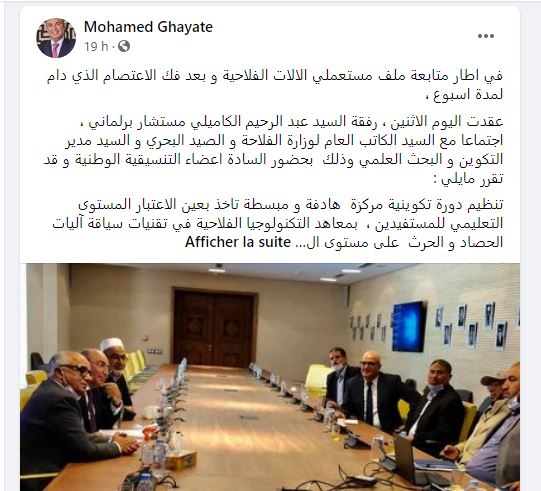 عقد محمد غيات، المستشار البرلماني عن دائرة سطات، أمس الإثنين، رفقة عبد الرحيم الكاميلي مستشار برلماني ، اجتماعا مع الكاتب العام لوزارة الفلاحة و الصيد البحري، ومدير التكوين و البحث العلمي، وذلك بحضور أعضاء التنسيقية الوطنية لأرباب الآلات الفلاحية للحرث و الحصاد.