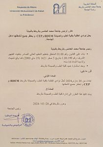 وفي نفس الاتجاه أكد رئيس جامعة الحسن الثاني بالدار البيضاء ضمن مقرر موجه لعميد كلية الطب “ابتداء من 19 مارس 2024 تُحل جميع مكاتب الطلبة بكلية الطب والصيدلة BDEPC و CEMC وبحظر جميع أنشطتها داخل الجامعة”.