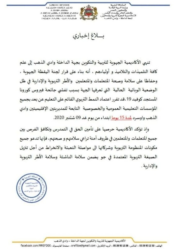 أنهت المديرية الجهوية للتربية والتكوين بجهة الداخلة واد الذهب إلى علم كافة التلاميذ والتلميذات وأوليائهم أنه بناء على قرار لجنة اليقظة الجهوية، وحفاظا على سلامة وصحة المتعلمات والمتعلمين والأطر التربوية والإدارية في ظل الوضعية الوبائية الحالية التي تعرفها الجهة بسبب تفشي جائحة فيروس كورونا المستجد، قد تقرر اعتماد النمط التربوي القائم على “التعليم عن بعد” بجميع المؤسسات التعليمية والخصوصية التابعة للمديريتين الإقليميتين واد الذهب وأوسرد لمدة 15 يوم ابتداء من يوم غد 09 شتنبر 2020.