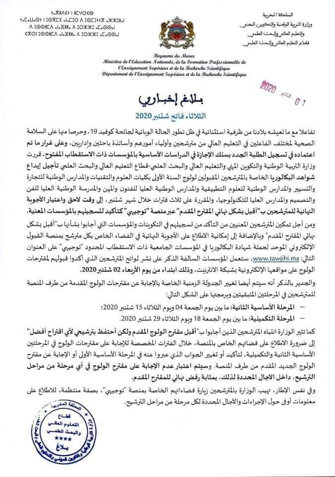 أصدرت وزارة التربية الوطنية والتكوين المهني والتعليم العالي بلاغا لها، بشأن تأجيل إيداع شواهد البكالوريا، الخاصة بالمترشحين المقبولين لولوج السنة الأولى، بكليات العلوم و التقنيات والمدارس الوطنية للتجارة والتسيير والمدارس الوطنية للعلوم التطبيقية والمدارس الوطنية العليا للفنون والمهن والمدرسة الوطنية العليا للفن والتصميم والمدارس العليا للتكنولوجيا.