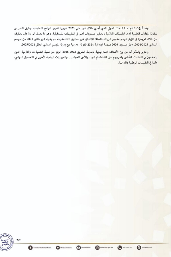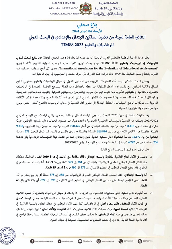 شاركت بلادنا في دورة 2023 للبحث الدولي للرياضيات والعلوم TIMSS 2023 بمستويي الرابعة ابتدائي والثانية إعدادي، والتي تزامنت مع الموسم الدراسي 2023/2022، بعينات من التلاميذ والمؤسسات التعليمية العمومية والخصوصية، على مستوى الجهات وعلى المستوى الوطني.