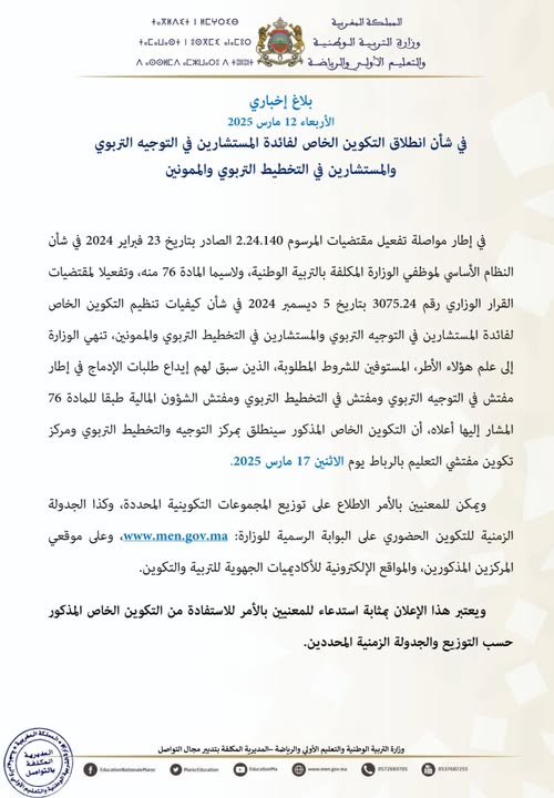 نشرت وزارة التربية الوطنية والتعليم الأولي والرياضة بلاغا في شأن انطلاق التكوين الخاص لفائدة المستشارين في التوجيه التربوي والمستشارين في التخطيط التربوي والممونين.