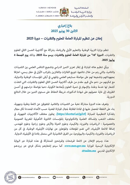 أعلنت وزارة التربية الوطنية والتعليم الأولي والرياضة عن تنظيم المباراة العامة للعلوم والتقنيات-دورة 2025، بشراكة مع أكاديمية الحسن الثاني للعلوم والتقنيات، الدورة 16، من المباراة العامة للعلوم والتقنيات برسم سنة 2025، وذلك يوم الجمعة 04 يوليوز 2025.