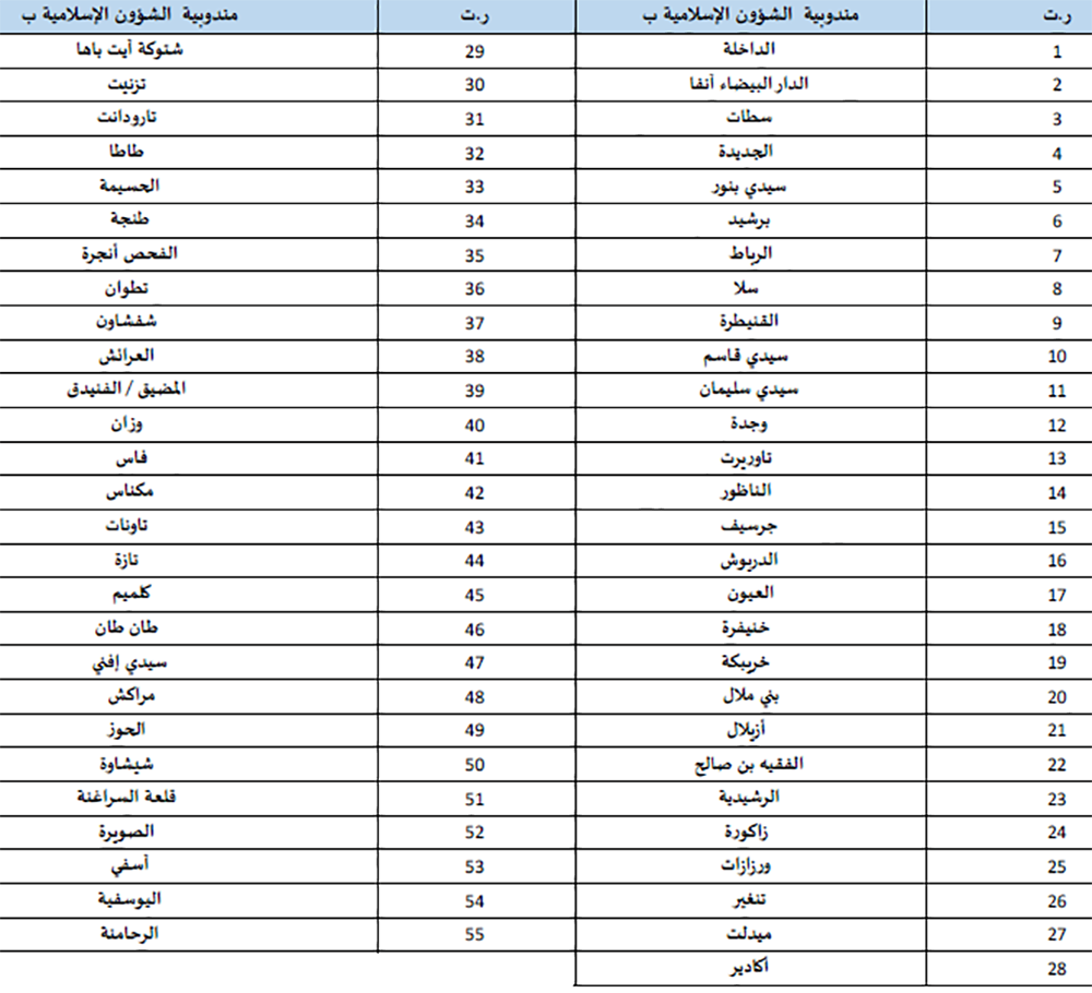 كما وضعت الوزارة قائمة بمندوبيات الشؤون الإسلامية الممكن التوجه إليها من طرف التلاميذ والطلبة لتسلم الشرائح الهاتفية تمكن من ولوج ومتابعة الدروس مجانا بمنصة دروسي وهي على الجدول التالي: