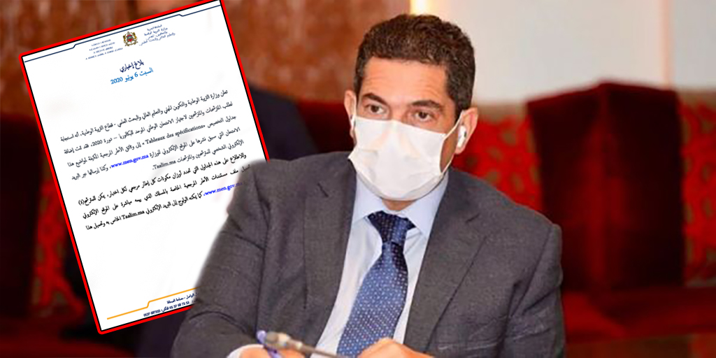 تعلن وزارة التربية الوطنية والتكوين المهني والتعليم العالي والبحث العلمي – قطاع التربية الوطنية، أنه استجابة لطلب المترشحات والمترشحين لاجتياز الامتحان الوطني الموحد للبكالوريا – دورة 2020، فقد تمت إضافة جداول التخصيص « Tableaux des spécifications» إلى وثائق الأطر المرجعية المكيفة لمواضيع هذا الامتحان التي سبق نشرها على الموقع الإلكتروني للوزارة www.men.gov.ma، وكذا إرسالها عبر البريد الإلكتروني الشخصي للمترشحين والمترشحات Taalim.ma.