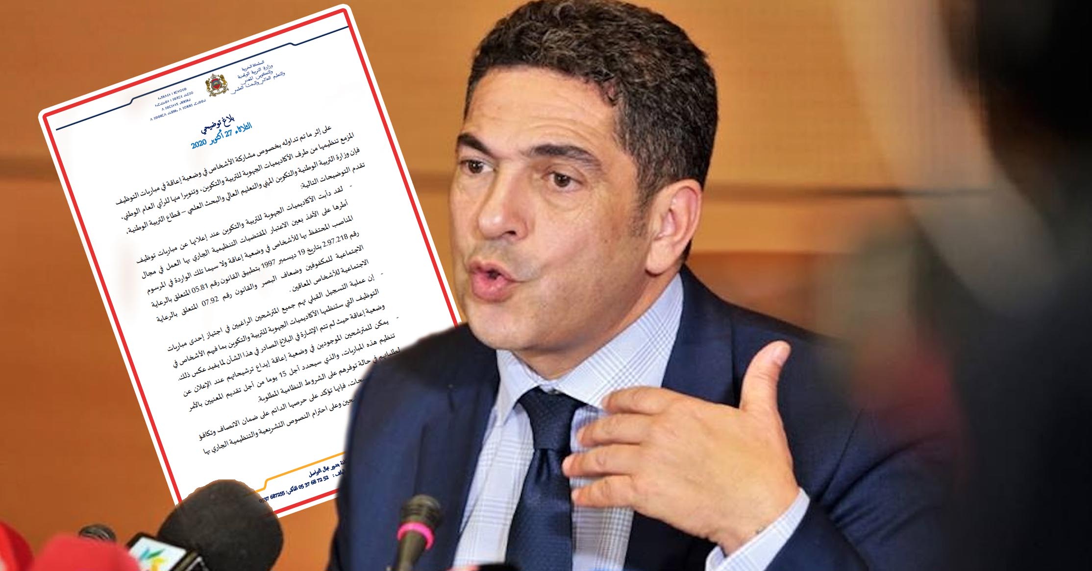 على إثر ما تم تداوله بخصوص مشاركة الأشخاص في وضعية إعاقة في مباريات التوظيف المزمع تنظيمها من طرف الأكاديميات الجهوية للتربية والتكوين، وتنويرا منها للرأي العام الوطني، فإن وزارة التربية الوطنية والتكوين المهني والتعليم العالي والبحث العلمي – قطاع التربية الوطنية، تقدم التوضيحات التالية: