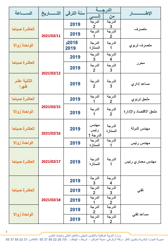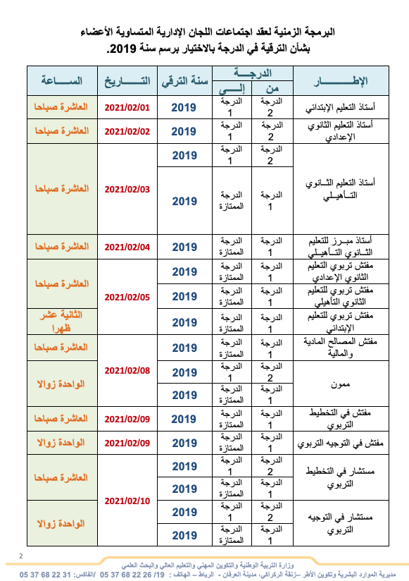 تعلن وزارة التربية الوطنية والتكوين المهني والتعليم العالي والبحث العلمي، أن اللجان الإدارية المتساوية الأعضاء المختصة إزاء الأطر التابعة لقطاع التربية الوطنية، ستشرع في عقد اجتماعاتها السنوية الخاصة بالنظر في جداول الترقي في الدرجة بالاختيار برسم سنة 2019، خلال الفترة المتراوحة ما بين فاتح و18 فبراير 2021 وذلك وفق الجدولة الزمنية التالية: