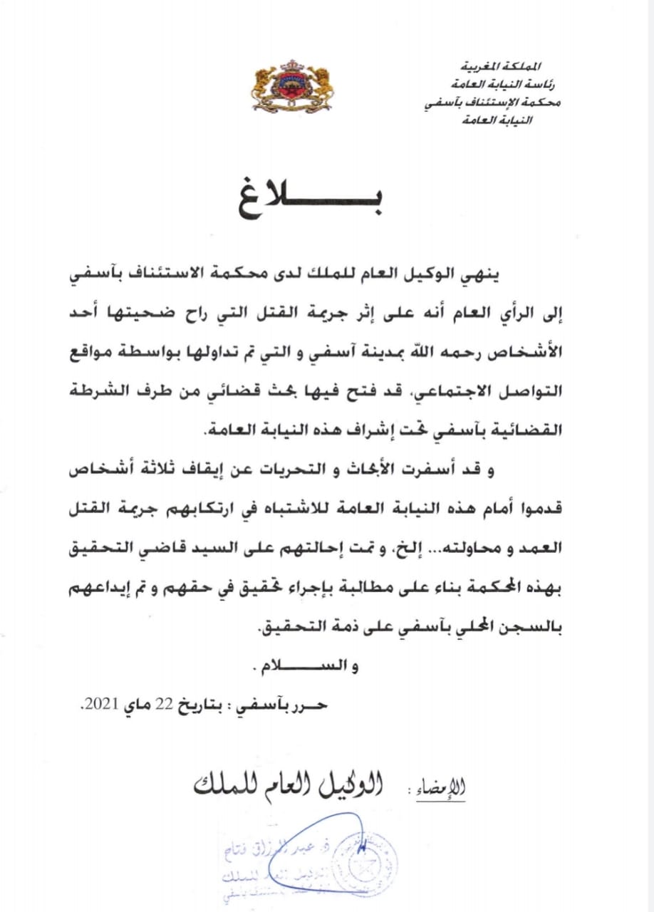 ينهي الوكيل العام للملك لدى محكمة الاستئناف بآسفي إلى الرأي العام أنه على إثر جريمة القتل التي راح ضحيتها أحد الأشخاص رحمه الله بمدينة آسفي والتي تم تداولها بواسطة مواقع التواصل الاجتماعي قد فتح فيها بحث قضائي من طرف الشرطة القضائية بآسفي تحت إشراف هذه النيابة العامة.