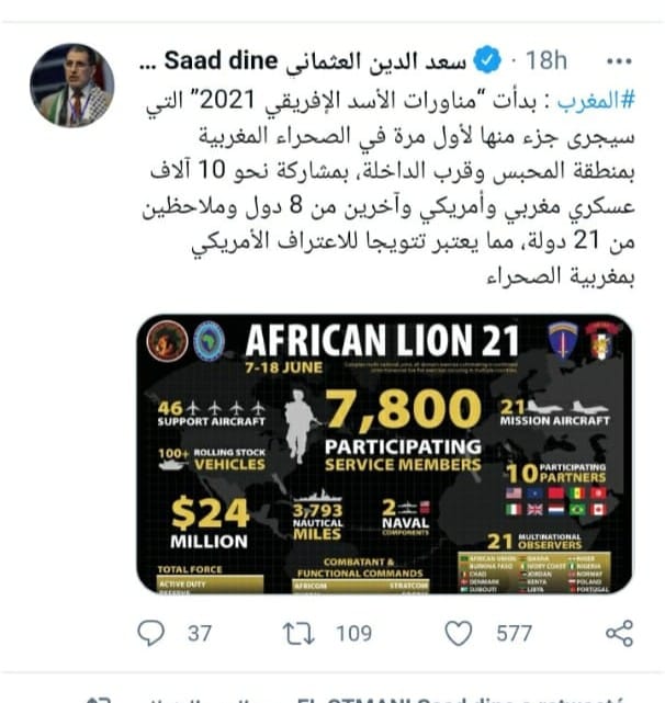 وجاء هذا النفي من “البنتاغون” الأمريكي، عقب تغريدة نشرها “سعد الدين العثماني”، رئيس الحكومة المغربية عبر حسابه الرسمي على “تويتر” نهاية الأسبوع المنصرم، أكد من خلالها أن: جزء من هذا التدريب السنوي الأضخم للقيادة العسكرية الأمريكية في أفريقيا (أفريكوم) سيتم بالصحراء المغربية”، الأمر الذي اعتبره “العثماني” حسب تغريدته: “تتويجا للاعتراف الأمريكي بمغربية الصحراء”، قبل أن يقوم بحذف هذه “التغريدة” في وقت لاحق.
