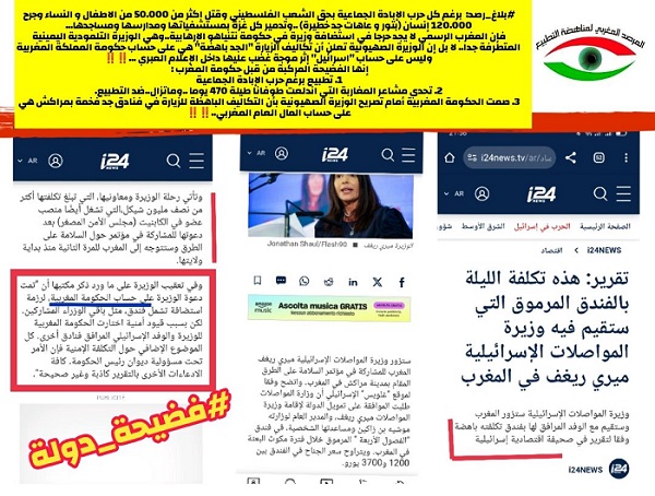 3. صمت الحكومة المغربية أمام تصريح الوزيرة الصهيونية بأن التكاليف الباهظة للزيارة في فنادق جد فخمة بمراكش هي على حساب المال العام المغربي..‼️‼️”.