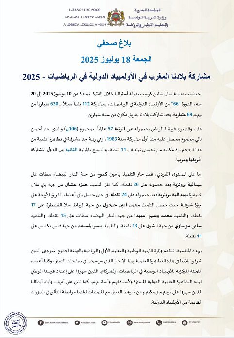 ✔️ توج الفريق الوطني المغربي، بحصوله على الرتبة 57 عالمياً، بمجموع (106ن) بمدينة سان شاين كوست بدولة أستراليا ضمن الدورة “66” من الأولمبياد الدولية في الرياضيات، بمشاركة 112 بلداً ممثلاً بــ 630 متبارياً من بينهم 69 متبارية.