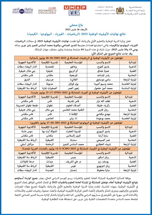 بلاغ صحفي.. نتائج نهائيات الأولمبياد الوطنية 2025