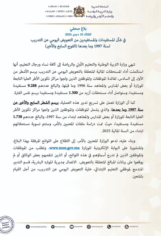 في شأن المستفيدات والمستفيدين من التعويض اليومي عن التدريب لسنة 1997 وما بعدها (الفوج السابع والأخير).