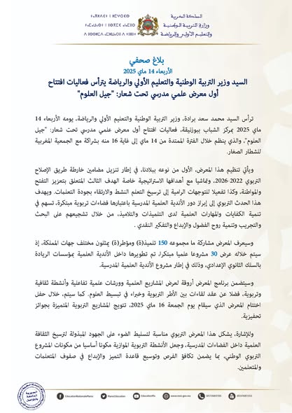 ترأس وزير التربية الوطنية والتعليم الأولي والرياضة محمد سعد برادة فعاليات افتتاح أول معرض علمي مدرسي تخت شعار “جيل العلوم”، والذي ينظم خلال الفترة الممتدة بين 14 ماي إلى غاية 16 منه بشراكة مع الجمعية المغربية للشطار الصغار.