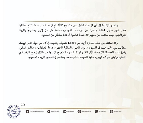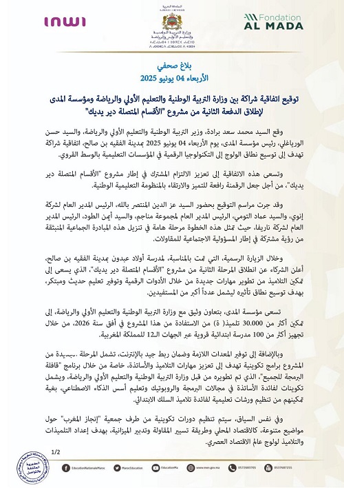 تسعى هذه الاتفاقية إلى تعزيز الالتزام المشترك في إطار مشروع “الأقسام المتصلة دير يديك”، من أجل جعل الرقمنة رافعة للتميز والارتقاء بالمنظومة التعليمية الوطنية.