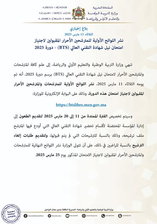 نشر وزارة التربية الوطنية والتعليم الأولي والرياضة اللوائح الأولية للمترشحين الأحرار المقبولين لاجتياز امتحان نيل شهادة التقني العالي (BTS) – دورة 2025.