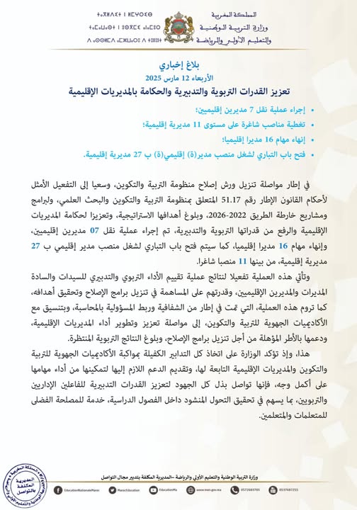 ✔️ هذا، وإذ تؤكد الوزارة على اتخاذ كل التدابير الكفيلة بمواكبة الأكاديميات الجهوية للتربية والتكوين والمديريات الإقليمية التابعة لها، وتقديم الدعم اللازم إليها لتمكينها من أداء مهامها على أكمل وجه، فإنها تواصل بذل كل الجهود لتعزيز القدرات التدبيرية للفاعلين الإداريين والتربويين، بما يسهم في تحقيق التحول المنشود داخل الفصول الدراسية، خدمة للمصلحة الفضلى للمتعلمات والمتعلمين.
