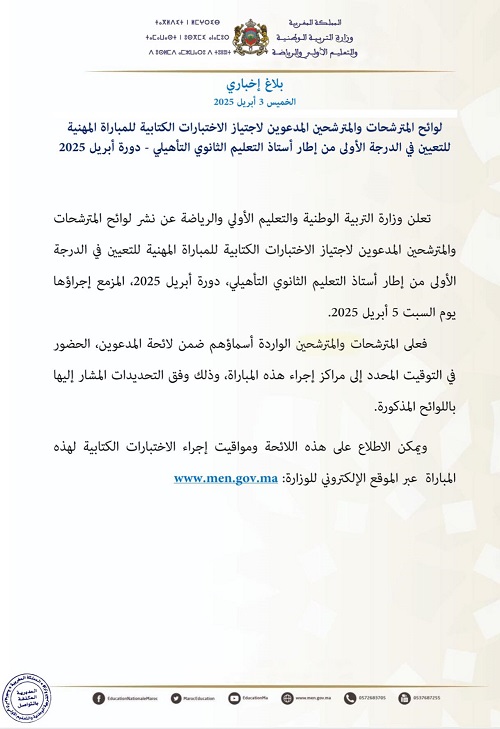 أعلنت وزارة التربية الوطنية والتعليم الأولي والرياضة نشرها لوائح المترشحات والمترشحين المدعوين لاجتياز الاختبارات الكتابية للمباراة المهنية للتعيين في الدرجة الأولى من إطار أستاذ التعليم الثانوي التأهيلي – دورة أبريل 2025.