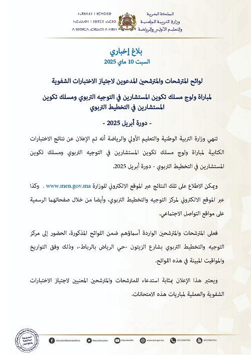 أعلنت وزارة التربية الوطنية والتعليم الأولي والرياضة عن نتائج الاختيارات الكتابية لمباراة ولوج مسلك تكوين المستشارين في التخطيط التربوي والتوجيه التربوي بمركز التوجيه والتخطيط التربوي- دورة أبريل 2025.