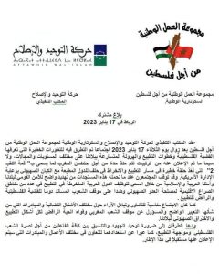 وكان المكتب التنفيذي لحركة التوحيد والإصلاح والسكرتارية الوطنية لمجموعة العمل الوطنية من أجل فلسطين، عقدا أول أمس الثلاثاء 17 يناير 2023 اجتماعا “تم التطرق فيه للتطورات الخطيرة التي تعرفها القضية الفلسطينية وخطوات التطبيع والهرولة المتسارعة ببلادنا على مختلف المستويات والمجالات”.