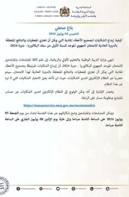 إيداع الشكايات لتصحيح الأخطاء المادية التي يمكن أن تعتري المعطيات والنتائج المتعلقة بالدورة العادية للامتحان الجهوي الموحد للسنة الأولى من سلك البكالوريا – دورة 2024.