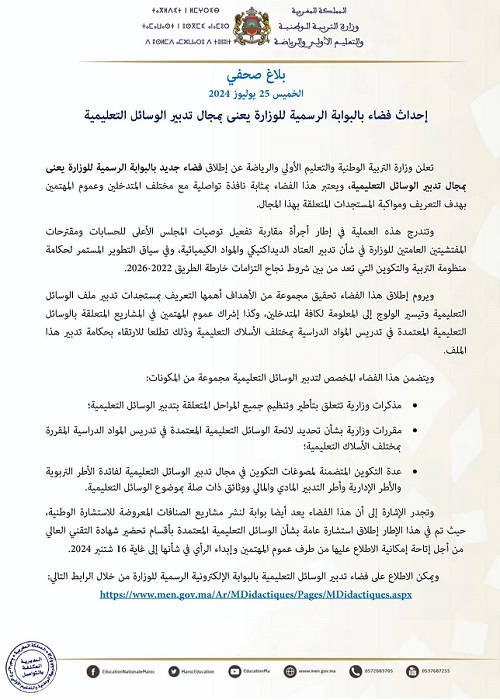 أعلنت وزارة التربية الوطنية والتعليم الأولي والرياضة عن إطلاق فضاء جديد بالبوابة الرسمية للوزارة يعنى بمجال تدبير الوسائل التعليمية، ويعتبر هذا الفضاء بمثابة نافذة تواصلية مع مختلف المتدخلين وعموم المهتمين بهدف التعريف ومواكبة المستجدات المتعلقة بهذا المجال.
