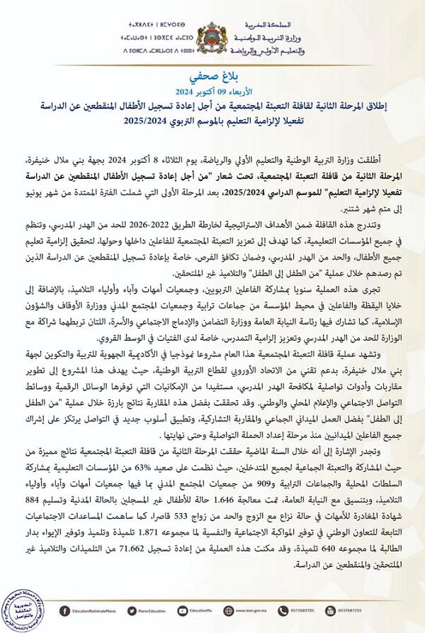 ✔️ أطلقت وزارة التربية الوطنية والتعليم الأولي والرياضة، يوم الثلاثاء 8 أكتوبر 2024، المرحلة الثانية من قافلة التعبئة المجتمعية، تحت شعار “من أجل إعادة تسجيل الأطفال المنقطعين عن الدراسة تفعيلا لإلزامية التعليم” للموسم الدراسي 2024/2025، بعد المرحلة الأولى التي شملت الفترة الممتدة من شهر يونيو إلى متم شهر شتنبر.