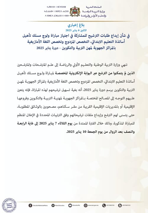 بلاغ إخباري في شأن إيداع طلبات الترشيح للمشاركة في اجتياز مباراة ولوج مسلك تأهيل أساتذة التعليم الابتدائي، التخصص المزدوج وتخصص اللغة الأمازيغية بالمراكز الجهوية لمهن التربية والتكوين – دورة يناير 2025.
