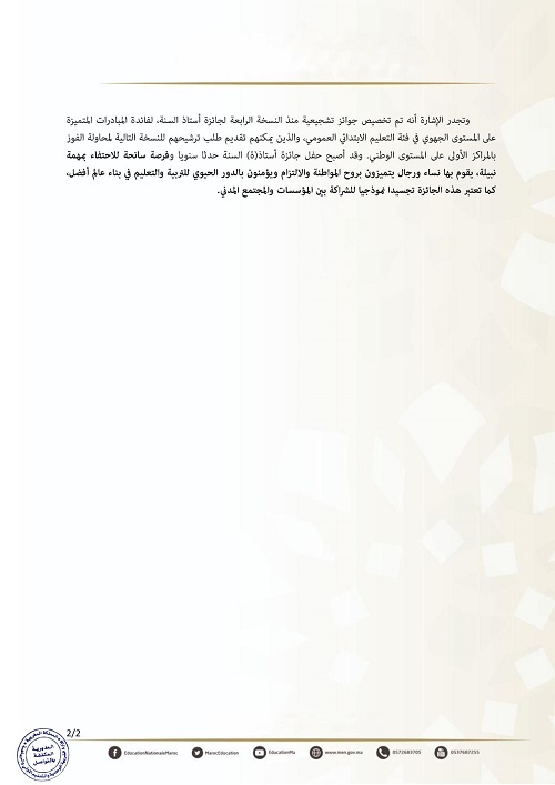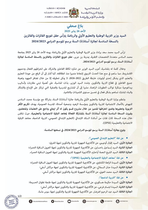 وتنظم وزارة التربية الوطنية والتعليم الأولي والرياضة جائزة أستاذ(ة) السنة، بشراكة مع مؤسسة محمد السادس للنهوض بالأعمال الاجتماعية للتربية والتكوين ومؤسسة الزهيد وجمعية أصدقاء المدرسة العمومية، بهدف تكريم الأطر التربوية وتحفيزها وتثمين انخراطها المتميز من خلال مشروع قسم يكون له أثر ايجابي وناجع على التعلمات والمتعلمين. وتميزت النسخة السادسة لجائزة أستاذ(ة) السنة بالمشاركة الفعالة لمعاهد الترقية الاجتماعية والتعليمية، حيث تنافس خلال هذه النسخة ثلاث فئات من أساتذة السلك الابتدائي (التعليم الابتدائي العمومي، التربية الدامجة، معاهد الترقية الاجتماعية والتعليمية (IPSE)).