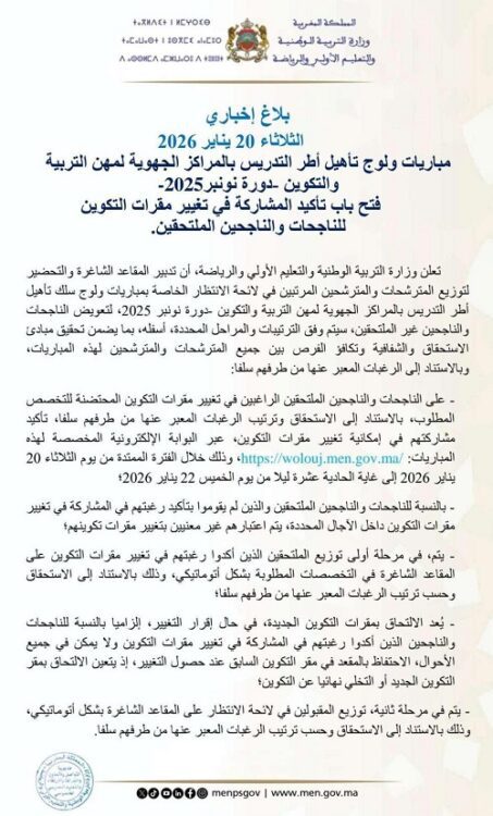 أصدرت وزارة التربية الوطنية والتعليم الأولي والرياضة بلاغا إخباريا الثلاثاء 20 يناير 2026 عن: