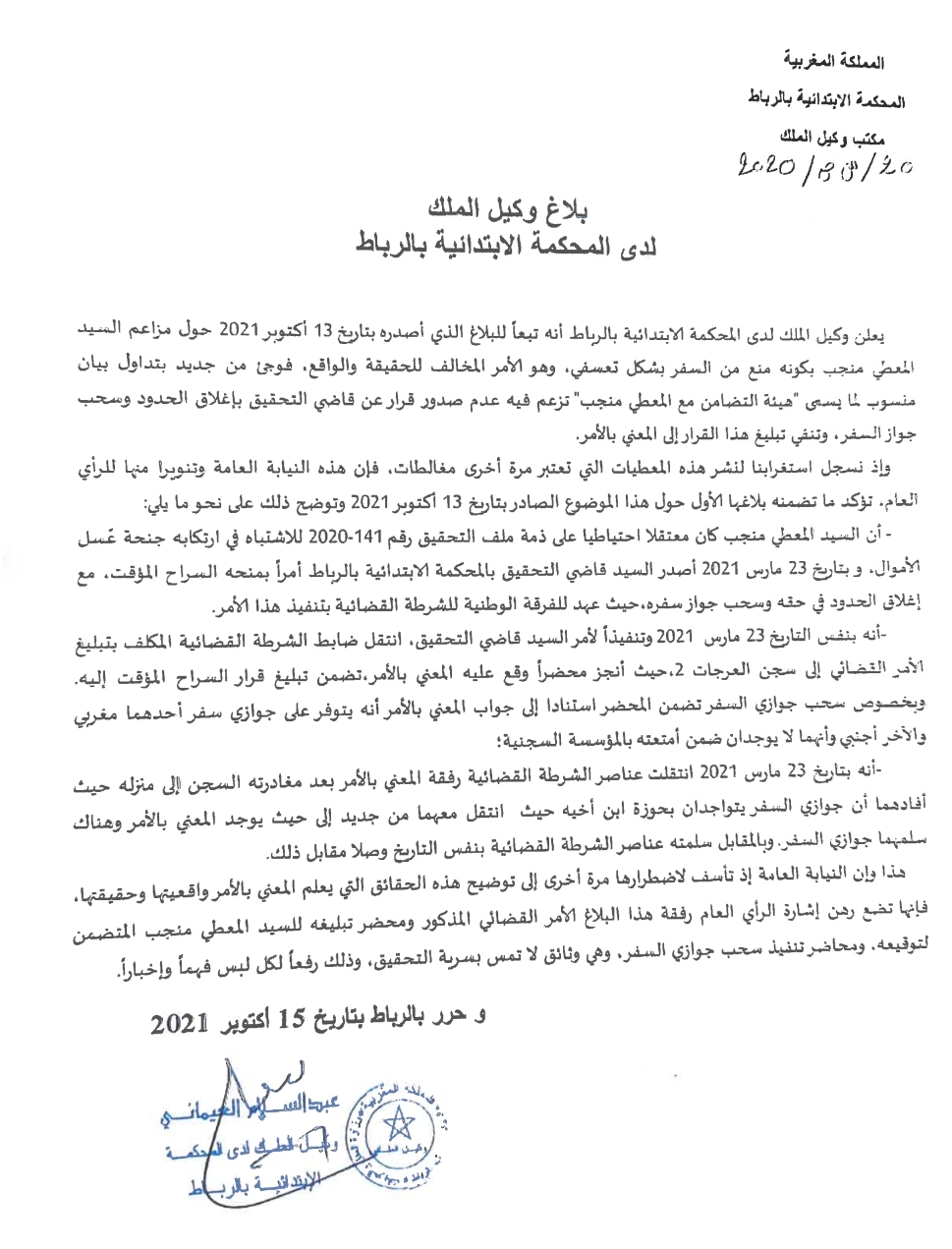 وأكد وكيل الملك في بلاغ اليوم الجمعة أنه فوجئ من جديد بتداول بيان منسوب للهيئة، مذكرا بالبلاغ الذي كان أصدره بتاريخ 13 أكتوبر 2021 حول مزاعم السيد المعطي منجب بكونه منع من السفر بشكل تعسفي، وهو الأمر المخالف للحقيقة والواقع.