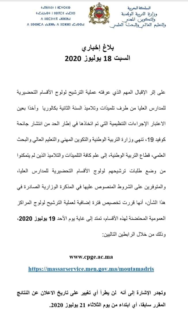 تنهي وزارة التربية الوطنية والتكوين المهني والتعليم العالي والبحث العلمي، قطاع التربية الوطنية، إلى علم كافة التلميذات والتلاميذ الذين لم يتمكنوا من وضع طلبات ترشيحهم لولوج الأقسام التحضيرية للمدارس العليا، والمتوفرين على الشروط المنصوص عليها في المذكرة الوزارية الصادرة في هذا الشأن، أنها قررت تخصيص فترة إضافية لعملية الترشيح لولوج المراكز العمومية المحتضنة لهذه الأقسام، تمتد إلى غاية يوم الأحد 19 يوليوز 2020، وذلك من خلال الرابطين التاليين:
