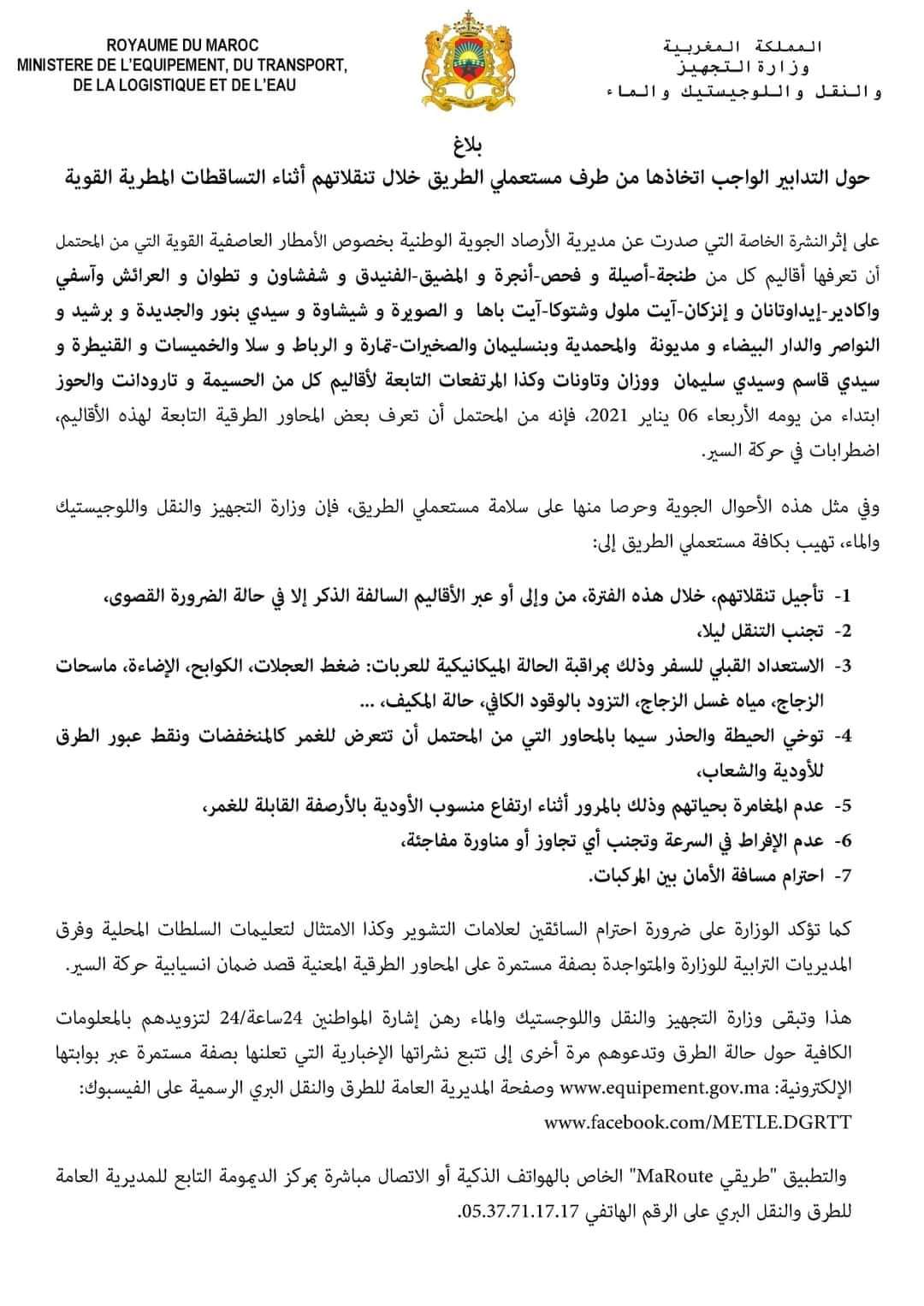 كما دعا بلاغ الوزارة، الى توخي الحذر والحيطة بالمحاور التي من المحتمل ان تتعرض للغمر كالمنخفضات ونقط عبور الطريق.