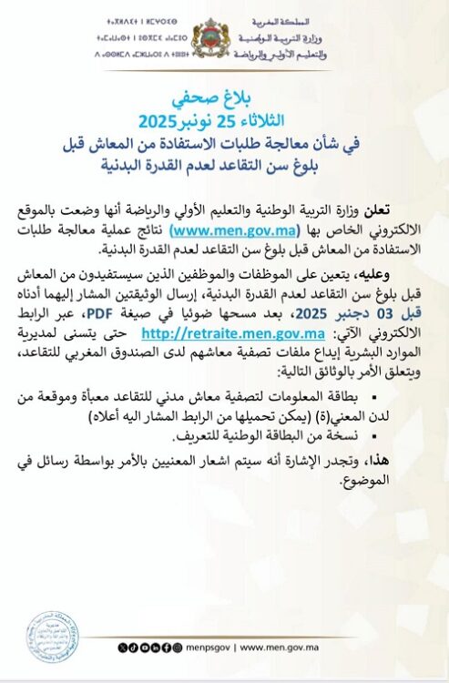 بلاغ.. وزارة التربية الوطنية تعلن نتائج طلبات المعاش قبل سن التقاعد