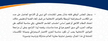وأكد بلاغ المجلس الوطني، الذي توصل موقع “هوية بريس” بنظيره، أن مراجعة القوانين الانتخابية يجب أن تكون مناسبة لتعزيز الاختيار الديمقراطي وصيانة المكتسبات المحققة في هذا المجال.