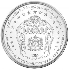 أصدر بنك المغرب قطعة نقدية تذكارية فضية من فئة 250 درهما ، تخليدا للذكرى الواحدة والعشرين لتربع صاحب الجلالة الملك محمد السادس على عرش أسلافه المنعمين.