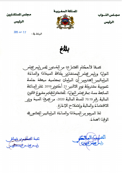 أصدر البرلمان المغربي بمجلسيه بلاغا يدعوا فيه كافة النواب والنائبات بالحضور للمشاركة في جلسة عمومية يوم الاثنين 21 أكتوبر 2019 على الساعة السابعة مساء بمقر مجلس النواب.