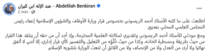 في تفاعل مع الجدل الذي أثاره قرار وزارة الأوقاف والشؤون الإسلامية القاضي بإعفاء رئيس المجلس العلمي المحلي بفجيج، خرج عبد الإله بنكيران، رئيس الحكومة الأسبق، بتصريح يعلّق فيه على موقف الدكتور أحمد الريسوني، الرئيس السابق للاتحاد العالمي لعلماء المسلمين، بشأن هذه القضية.