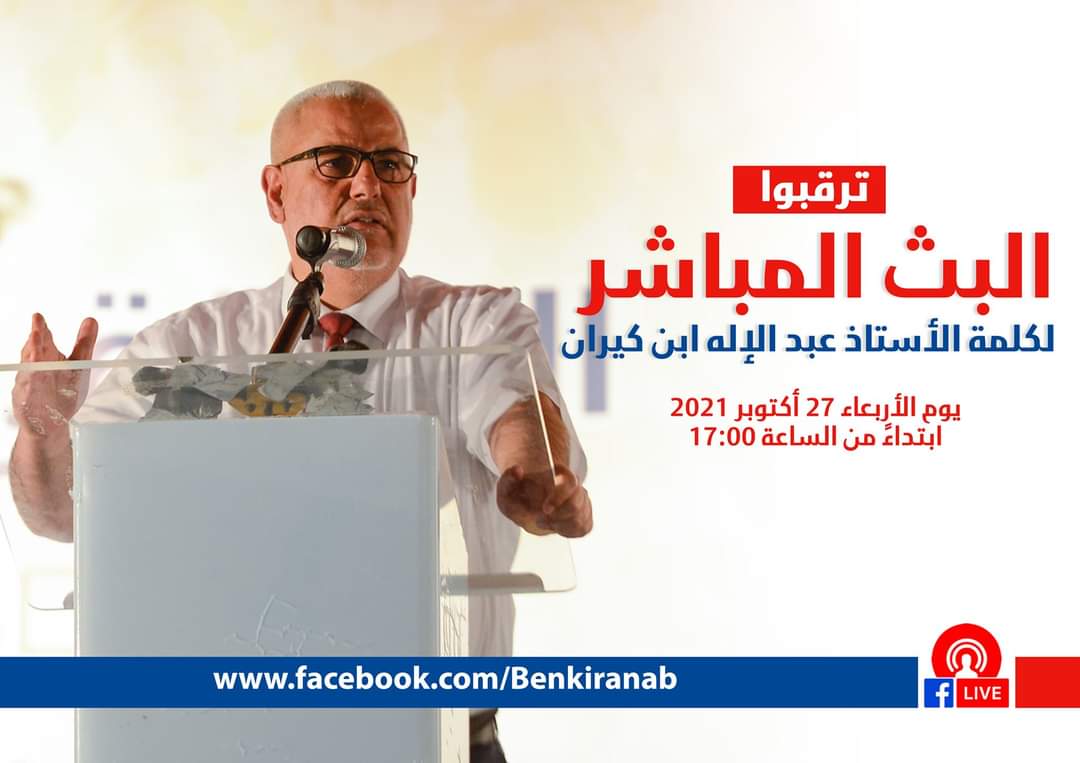 دعا عبد الإله بنكيران، الأمين العام السابق لحزب “العدالة والتنمية”، جمهوره إلى متابعة البث المباشر لكلمة يلقيها، اليوم الأربعاء، ابتداء من الساعة الخامسة مساء، على صفحته الرسمية ب”فيسبوك”.
