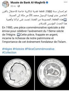 وأورد منشور الصفحة “تم إصدار، سنة 1980، قطعة نقدية تذكارية خاصة للاحتفال بالقرن الخامس عشر لهجرة الرسول محمد ﷺ من مكة إلى المدينة”.
