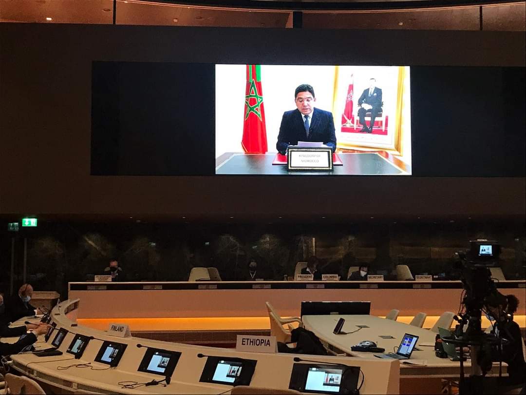 ويبدو من خلال الصورة المنشورة، على نفس الصفحة، أن أن وزير الخارجية المغربي ألقى كلمته، عن طريق تقنية الاتصال المرئي، عن بعد.